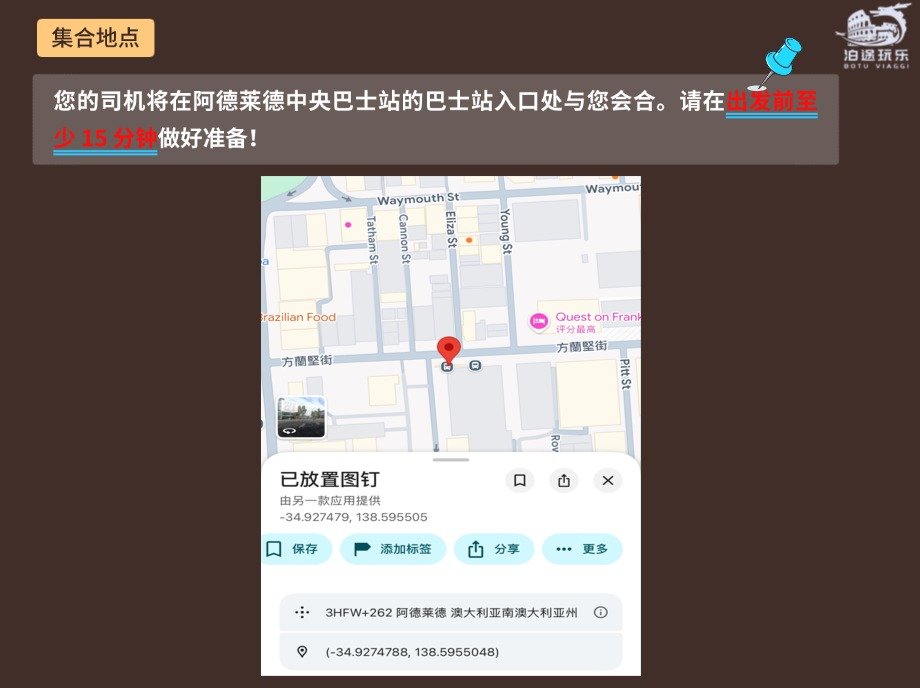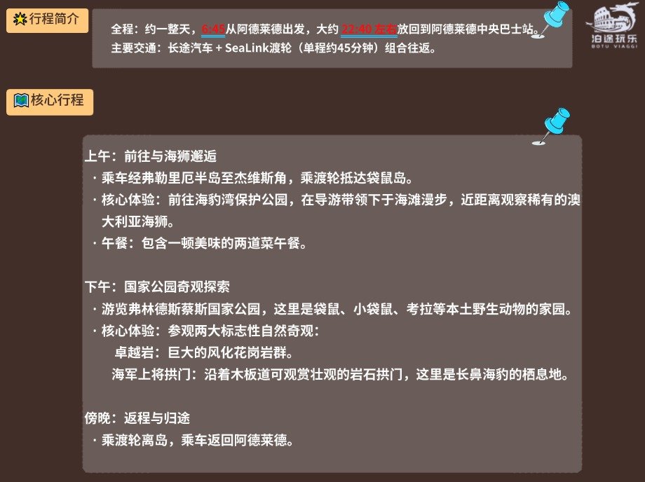 全程:约一整天,6:45从阿德莱德出发,大约 22:40 左右放回到阿德莱德中央巴士站。