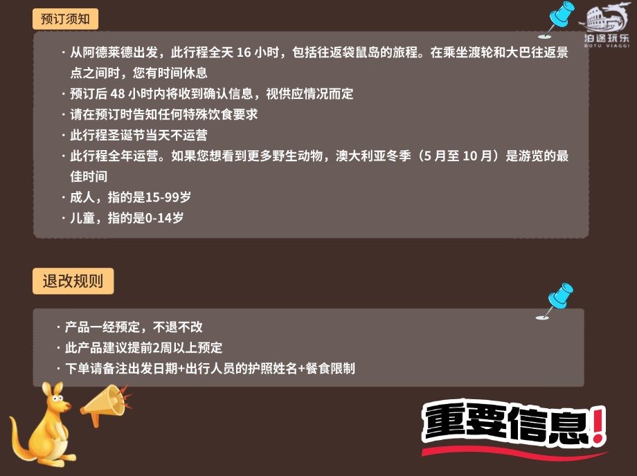 从阿德莱德出发,此行程全天 16 小时,包括往返袋鼠岛的旅程。在乘坐渡轮和大巴往返景点之间时,您有时间休息